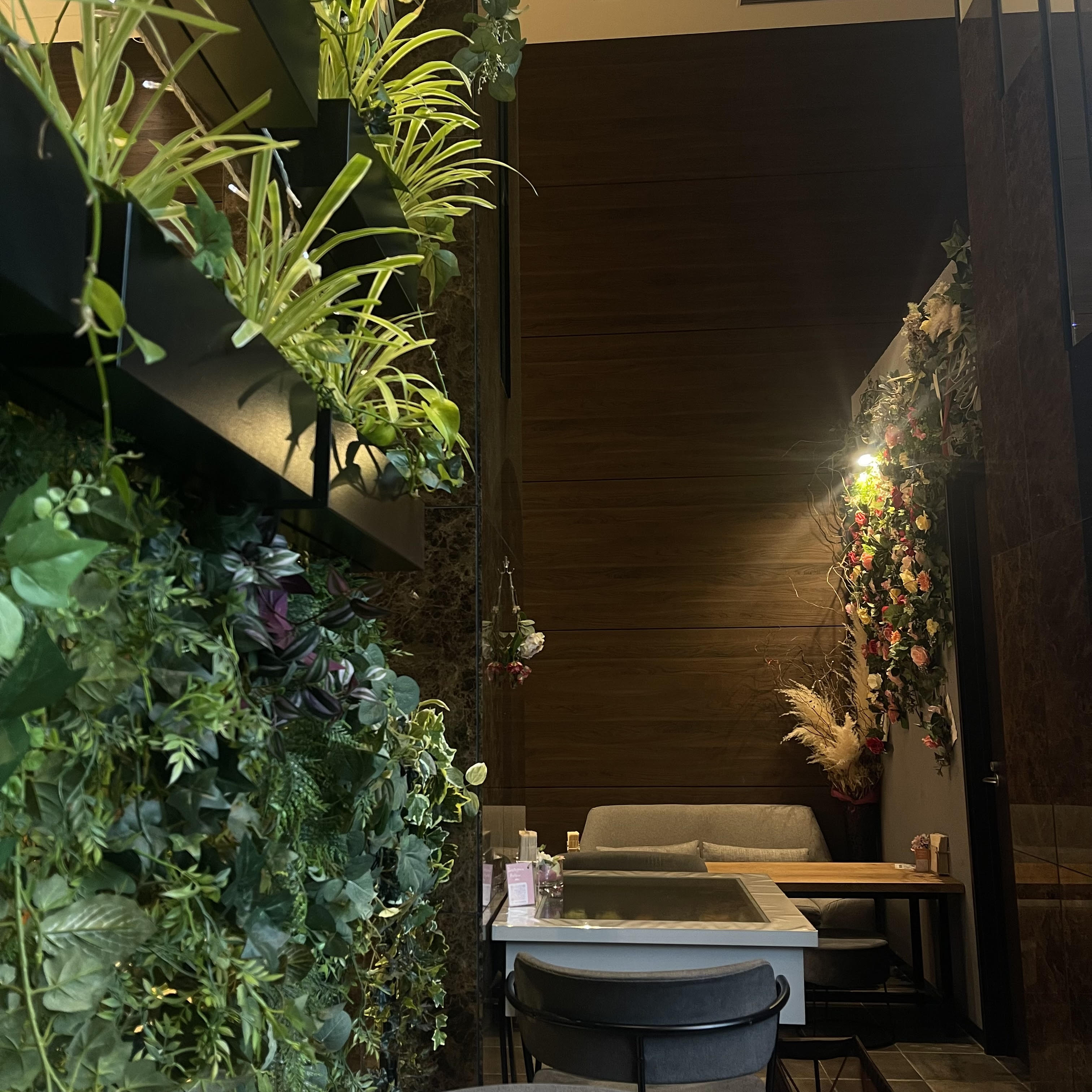 店内はドライフラワーや植栽などの装飾にこだわった癒しの空間になっていて