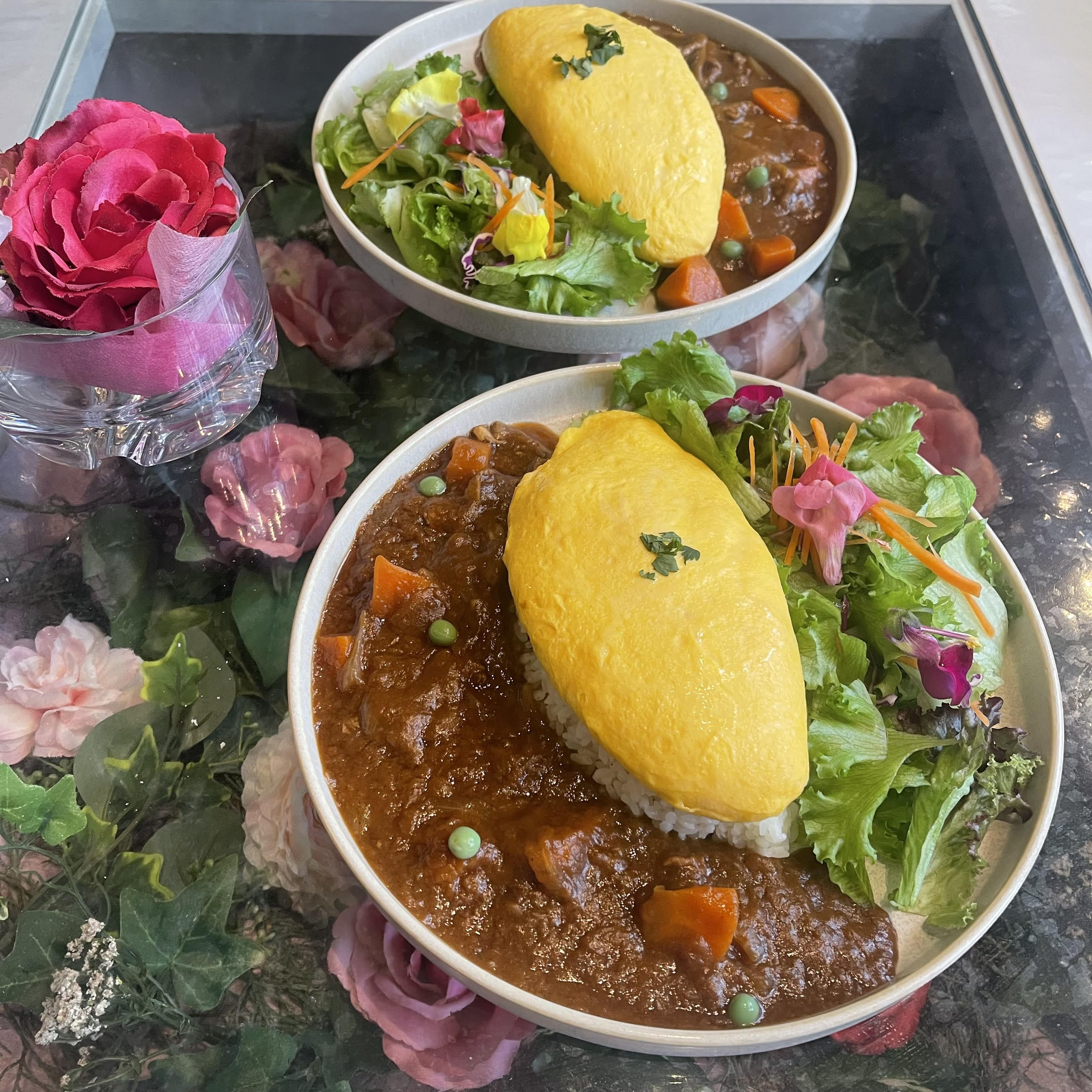 卵がふわふわとろとろでお花も上にのっていて、こちらのお花は食べられるそうです😳💕