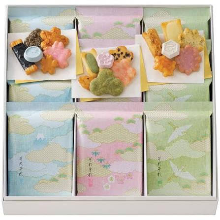 「富士」・「松竹梅」・「鶴」の三種類の幸せの願いを、おかきとパッケージで表されています✨
